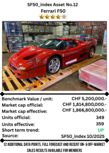 The Ferrari F50 continues to gain traction as collectors seek the last true naturally aspirated V12 hypercar built without electronic driver aids. With global demand rising and supply tightly controlled, its SF50 Index rating remains among the strongest in the 4-Star segment.