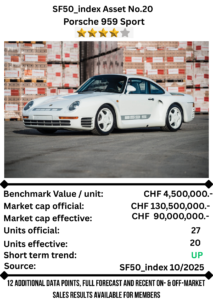 Within the SF50_index, the 959 Sport sits in the upper 4-Star segment — a rare blue-chip asset with strong liquidity and limited supply. Prices remain supported by Porsche collectors seeking the purest factory evolution of the 959 concept.