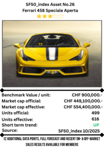 The SF50_index identifies the 458 Speciale Aperta as one of the most traded “modern classics” — outperforming several newer hybrid Ferraris as investors pivot back to analog driving purity and limited production models with enduring emotional value.